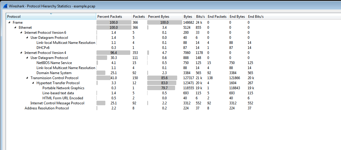 まずは何もフィルターをかけず、Statistics -> Protocol Hierarchyからキャプチャされた通信プロトコルの内訳を確認する。