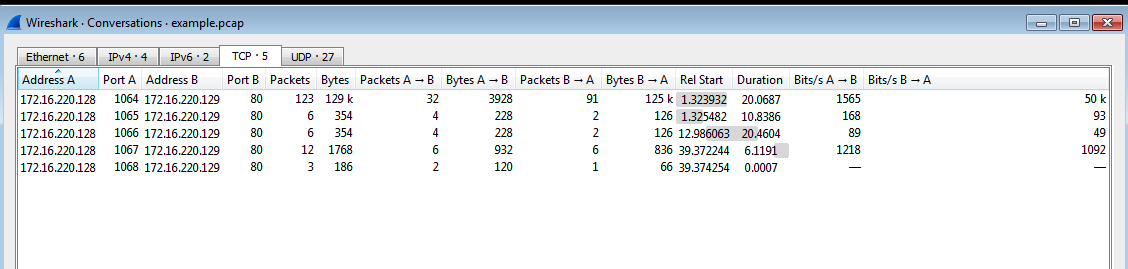 Statistics -> ConversationsからTCP・UDPのコネクション数を確認する。