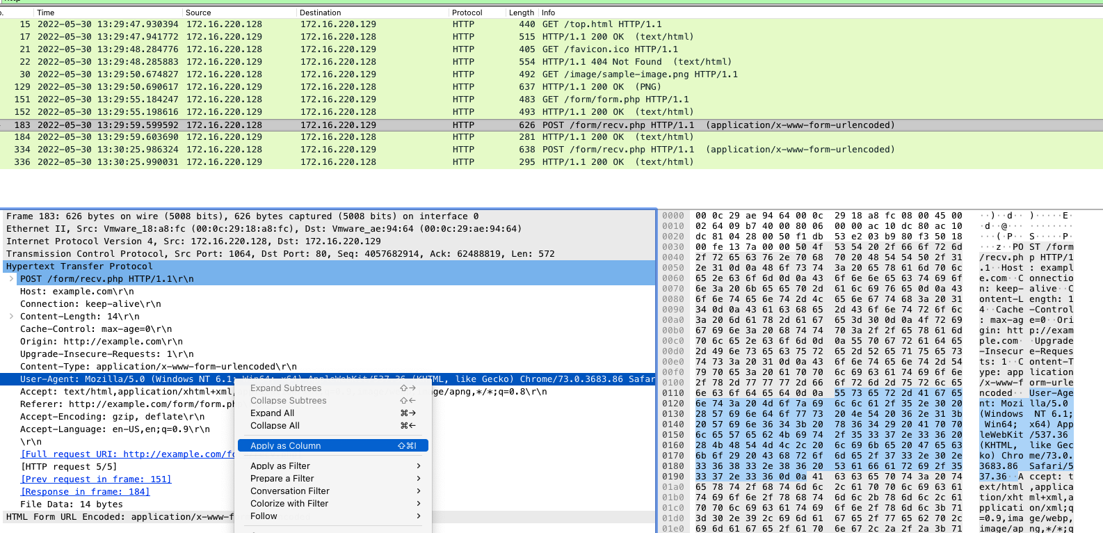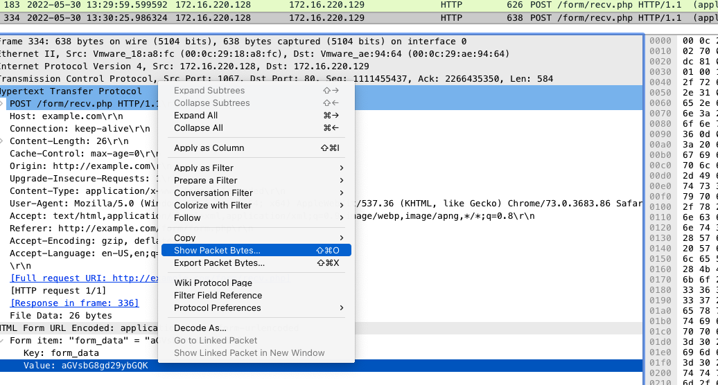 任意のパケットを選択して右クリックし、Export Packet Bytesでパケットを抽出する。