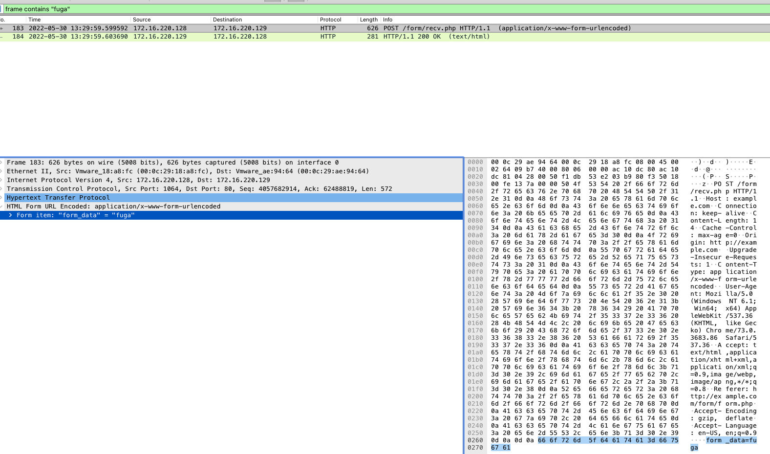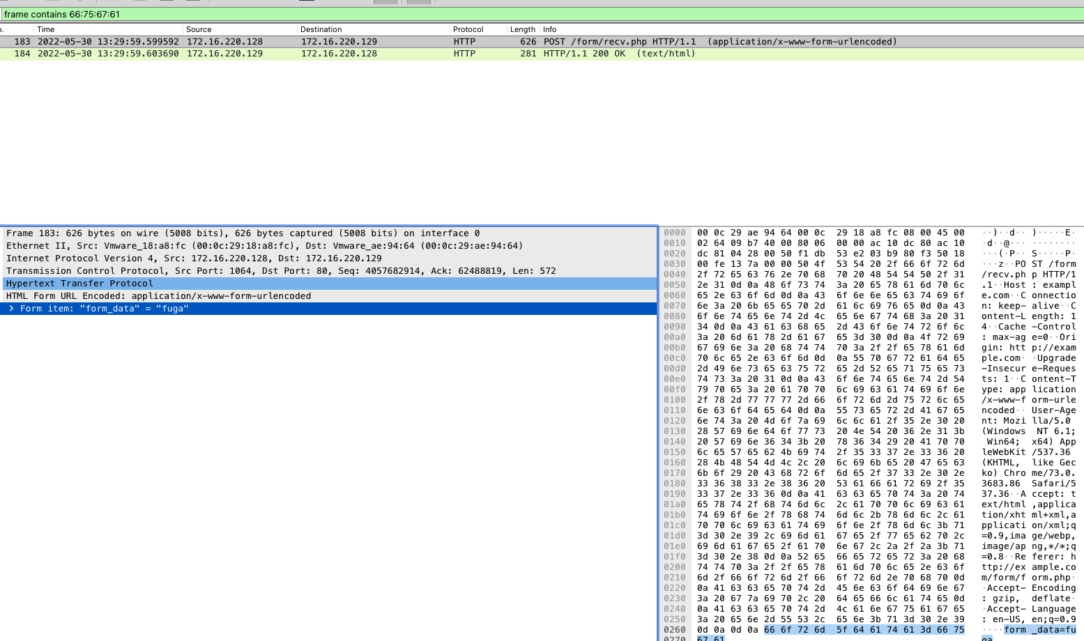 以下はframe containsフィルターを用いて0x66 0x75 0x67 0x61というバイト・パターンを含むパケットを検索している。(0x66 0x75 0x67 0x61 をHEXデコードするとfugaとなる)