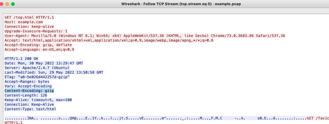 Webサーバーからの応答データがgzip圧縮されていた場合、Follow TCP Streamではコンテンツを確認できないことがある。