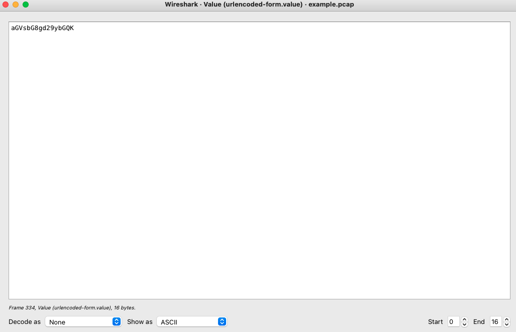 以下はHTTPのPOSTリクエストに乗せられたaGVsbG8gd29ybGQKというBase64データをデコードする際の様子。