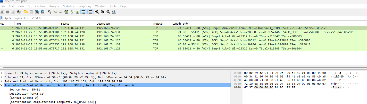 192.168.74.131:55411と192.168.74.128:80でTCPのハンドシェイクを行っているのが分かる。