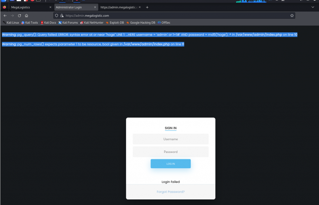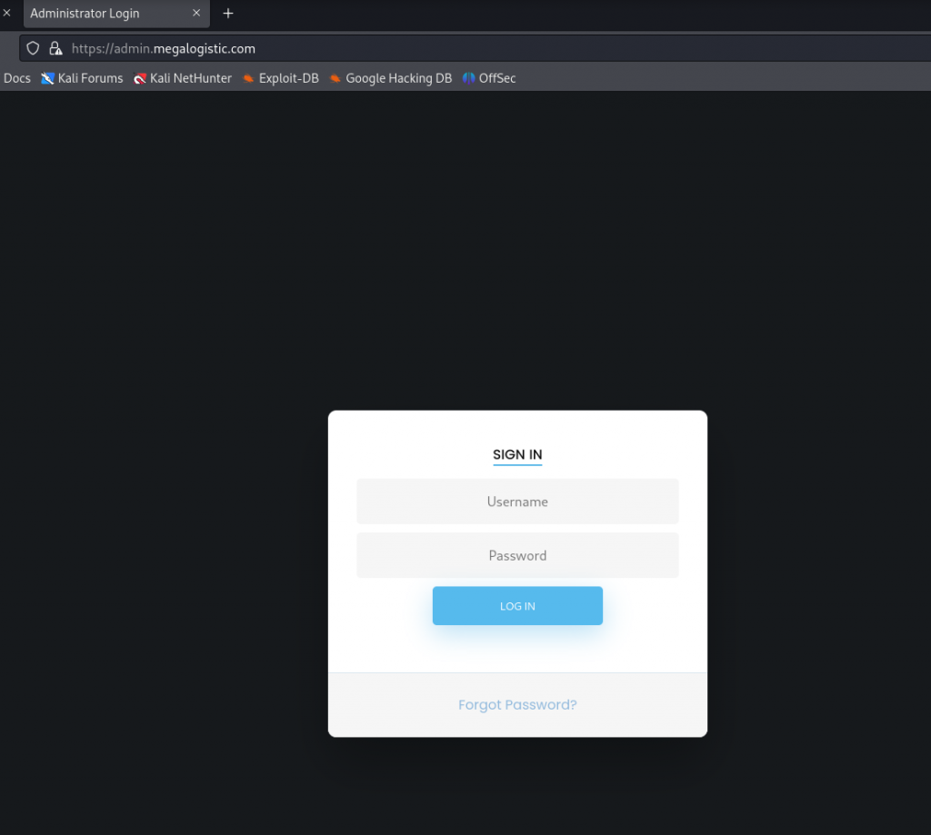続いて、nmapのスキャン結果より、443番ポート (HTTPS)にてadmin.megalogistic.comというWebサイトがホストされているようだったので、/etc/hostsファイルに以下のエントリーを追加し、ブラウザでアクセスしてみた。