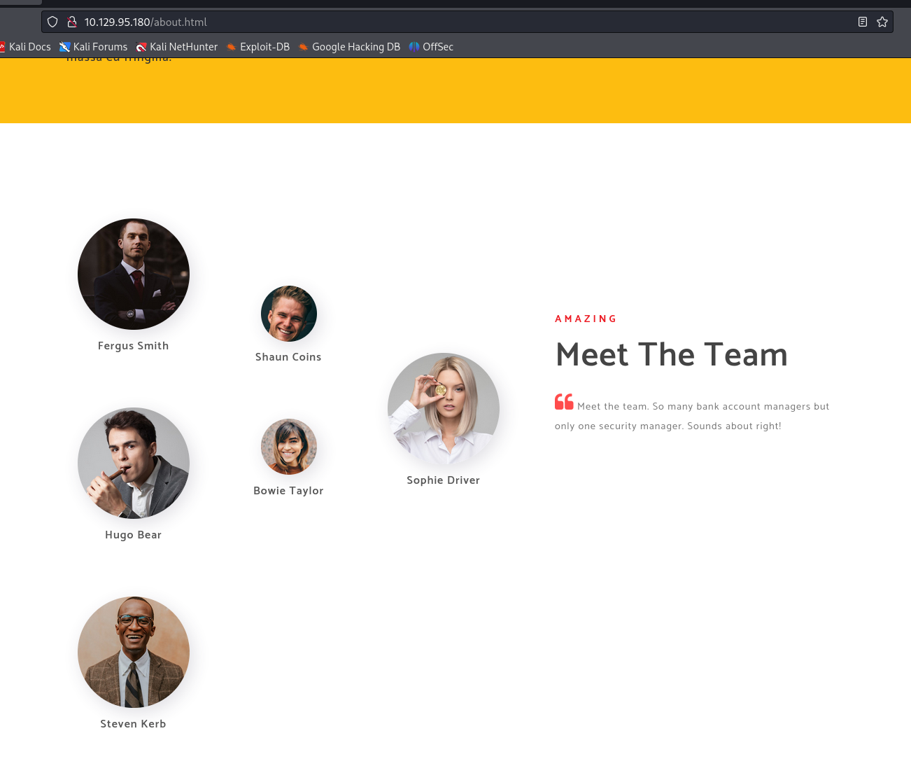 攻略方法として考えられるのは、About Usページ (/about.html)にリストされている従業員名をユーザー名に置き換えて、AS-REP RoastingやKerberoastingを行うというもの。ただし、通常これらの攻撃にはドメインユーザー名とパスワードが必要なのだが、今のところパスワードに関する情報はない。