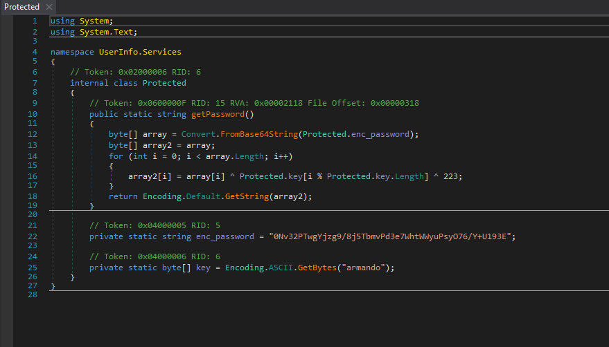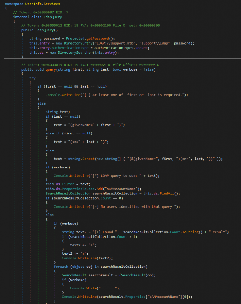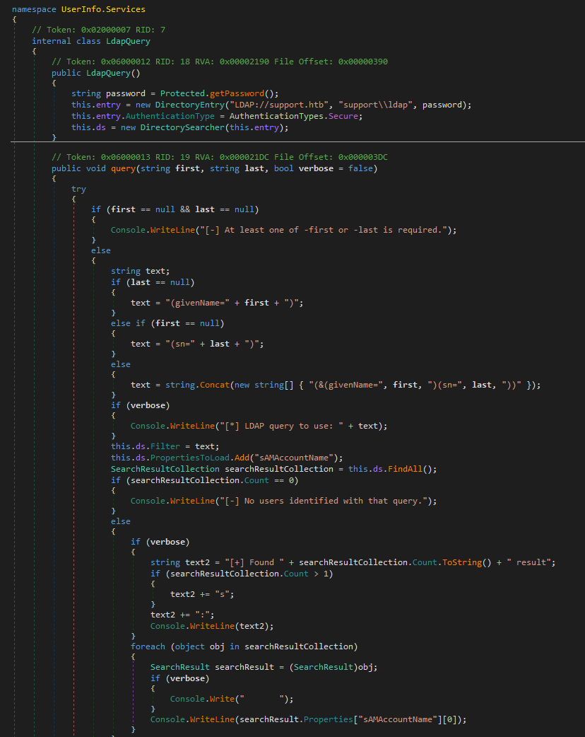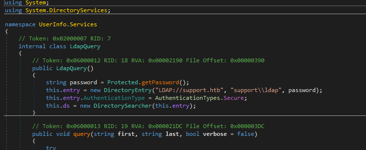 ファイルをdnSpyで開いてソースコードを眺めたところ、support\ldapというユーザー名を発見。